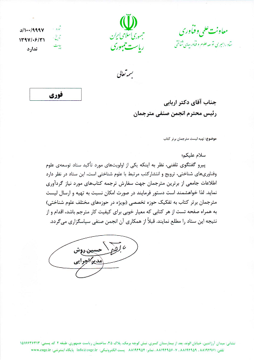 پیرو درخواست ارایهشده از سوی ستاد راهبری توسعه علوم و فناوریهای شناختی معاونت علمی و فناوری ریاست جمهوری، مبنی بر معرفی مترجم حرفهای مسلط به حوزهی علوم شناختی، از کلیهی علاقمندان دعوت بعمل میآید تا پایان وقت اداری روز سهشنبه ۱۷ مهر ماه ۱۳۹۷ ، نمونه ترجمهی خود در این حوزه را به همراه رزومه خود به آدرس ایمیل انجمن (info@tiat.ir) ارسال نمایند.