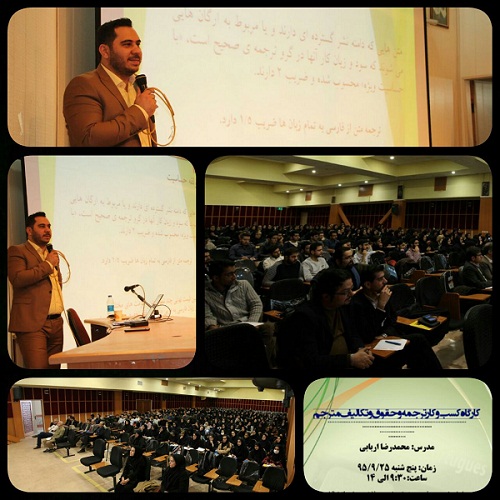 در این کارگاه با حضور مسئولین دانشگاه خیام برگزار شد، محمدرضا اربابی، رییس انجمن صنفی مترجمان شهر تهران ضمن ابراز خرسندی از استقبال پرشور دانشجویان مشهدی به سه اصل مهم در حوزه کسب و کار ترجمه اشاره کرد: «این اصل نانوشته ضامن موفقیت فرد در بازار کار است: پشتکار، پژوهندگی و پول سازی».