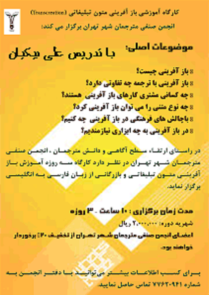 در راستای ارتقاء سطح آگاهی و دانش مترجمان ، انجمن صنفی مترجمان شهر تهران در نظر دارد کارگاه سه روزه آموزش باز آفرینی متون تبلیغاتی و بازرگانی از زبان فارسی به انگلیسی برگزار نماید.